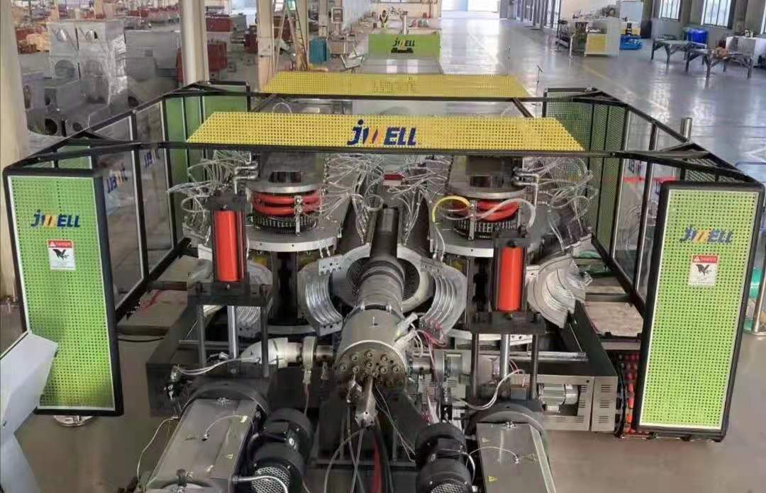 金緯臥式機主要生產PE(聚乙烯)、PP(聚丙烯)兩種材質的波紋管,由擠出機、擠出模具、成型機、噴淋槽、牽引機、切割機、堆放機、電控系統等部分組成。