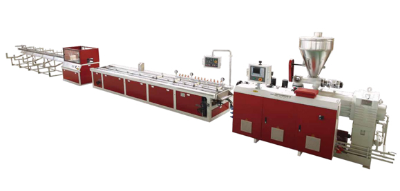 目前兩步法應用較為廣泛,一般是用錐雙擠出機或平雙擠出機造粒,再用錐雙或單螺桿擠出機擠出成型制品,主要使用在室內外地板、護欄、托盤等PE一類木塑產品的擠出成型。主要優點是:操作簡單,對生產員工整體技術水平要求較低,對配套模具和擠出成型設備要求相對比一步法要低。